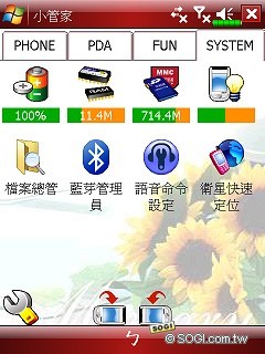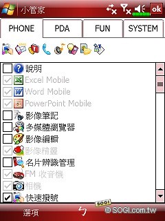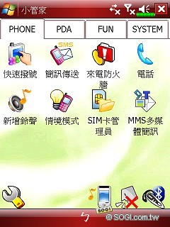 與其他 Windows Mobile 6 智慧產品,X500+ 同樣整合了 Windows Live 服務、Office Mobile 文書處理與記憶卡加密、軟體更新等基本功能,不過倚天在 PDA手機,一向也以豐富的客製化軟體功能為主要賣點,最明顯的地方莫過於 Today桌面,可直接在桌面點選快捷圖示進行軟體操作,當然也可透過倚天小管家程式,利用頁面式的分類管理,自行設定功能分類,方便個人管理使用。