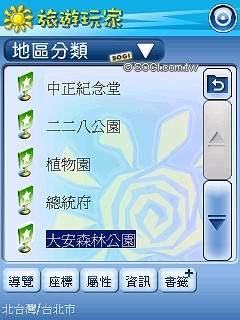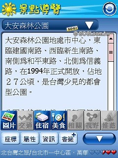 X500+ 的 GPS 與景點書同樣可以互相連動,無論從 PaPaGo 圖資或是由景點書啟動,都能隨時連接顯示景點所在位置,而使用者可以透過地區與類型分類去選取想查詢的景點資訊,都有詳細且豐富的圖解說明,不過可惜景點書的照片解析度仍維持在 QVGA(240 × 320 畫素)顯示等級,使畫面的細膩度稍嫌不足。