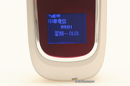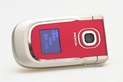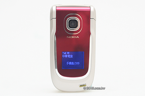 Nokia 2760 整體設計簡單俐落,在機身正面還擁有一面藍色灰階外顯示螢幕,最主要的功用在於時間的顯示 ( 顯示方式還可根據本身的喜好而設定 ) 與簡訊、來電提醒。此外,紅色面板的部分亦經過特殊的處理,拋光鏡面的處理隱約中可反照出一些機身前置之物品。