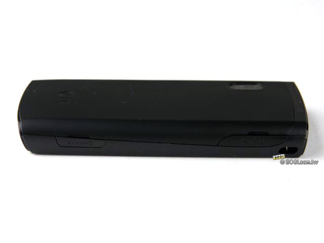 ▲LG P525 的正面上半部印有 LG 商標,商標上方為聽筒,聽筒內置黑色金屬網,除避免異物入侵外,也強化了設計的細節。另外,手機的鈴聲與音樂也是從這裡播放,而且音量非常大聲。