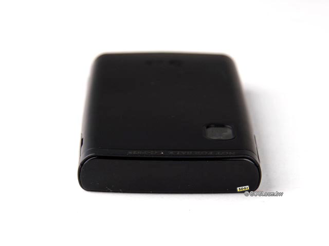 ▲背部僅有品牌 LOGO 與相機,非常簡潔素雅。採用消光黑塗裝,讓 LG P525 的美背逃離了指紋的魔掌,但相對的,若沾染到油漬也更為顯眼。相機為 200 萬像素的 CMOS 感光元件,相機模組周圍以同心圓金屬絲紋環繞點綴,在整體背部視覺上頗有畫龍點睛的效果。