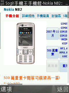 在上週 11/20 Nokia N82 的記者會上,SOGI 已於現場盡量為網友捕捉 N82 的蹤影,不管是外型設計還是主推功能,而 Nokia N82 也在將近一週的討論沸騰之後,終於於前幾天 11/27 正式舖貨,Nokia N82 隨機除了附贈一張 2GB microSD 記憶卡之外,也會贈送一套手機專屬之 PapaGo! R15 軟體平台給消費者,單機建議售價 23,500 元。