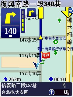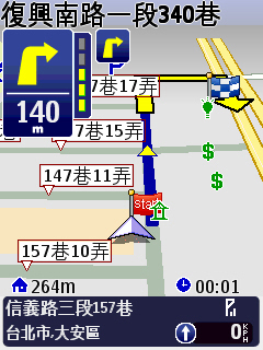 以餐廳為例,當搜尋到欲 GPS 導航前往的餐廳目的地之後,即可立即開啟導航,在導航的畫面呈現上,Nokia N82 內建二種呈現方式,分為稍具 3D 立體的導航畫面與 2D 平面導航畫面。