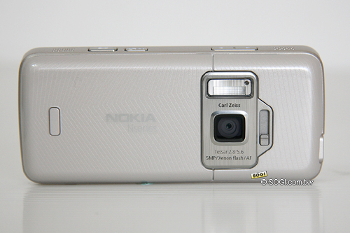 在機身背面,則是 Nokia N82 的 500 萬畫素卡爾蔡司鏡頭,在鏡頭旁邊還附予一個可保護鏡頭免於受損的相機鏡頭蓋卡榫,當然此卡榫也充當相機拍攝開啟快捷鍵。另外,N82 還支援一個氙氣閃光燈,可彌補光線不足之場景拍攝。
