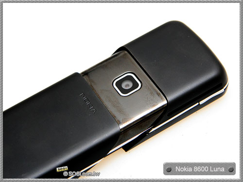 除此之外,Nokia 8600 Luna 還具備 200 萬畫素相機功能,相機鏡頭隱藏於機身背面,當滑開機身時,將可發現。另外,在機身背蓋材質上,就是前段所提到的霧面不鏽鋼材質。