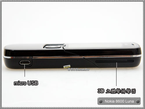 Nokia 8600 Luna 不僅整體機身簡潔俐落,就連機身側邊亦簡單的帶過,除了左右兩邊各自設有一個 3D 立體聲喇叭之外,Nokia 8600 Luna 還分別設有可傳輸檔案與充電功能共用的 mirco USB 插孔與音量調整鍵。另外,在 Nokia 8600 Luna 超薄 15.7 mm 的機身側邊下,還可發現其精湛的機身手工合成技術,一點都無法發現任何組合性細縫。