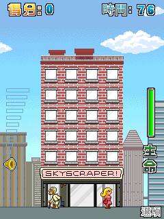除了 N-Gage 遊戲之外,玩家也可以下載手機版模擬器與單一 Java 遊戲,在討論區上已經有許多前輩所分享的眾多款遊戲,這裡我僅下載吶喊遊戲,它不是透過按鍵的方式來進行,玩家透過對手機吶喊,音量越高,遊戲畫面中的大樓就會倒塌,很有趣。