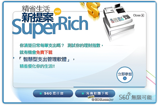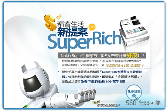 Nokia 為了持續宣揚 Symbian S60 作業平台在功能上的擴充性、實用性與打造個人化 S60,台灣官方特地於 Nokia 官網上開闢 S60 應用程式專區「S60 軟體大賞 - Super 行動新生活」( http://www.s60.nokia.com.tw/ ),每個月網站上將會推出不同的免費應用程式供使用者下載,而「智慧型支出管理軟體 ( ExpenseManager )」正是 Nokia S60 網站近期的精選軟體。