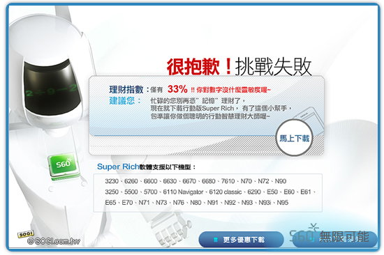 「智慧型支出管理軟體」在下載前,必須要先玩一個小遊戲,測驗一下您對理財方面的知識是否足夠。小遊戲測試結果不管如何,Nokia 就是會讓參與者免費下載這套實用財務管理工具。