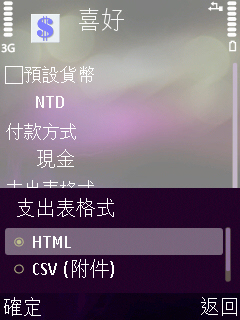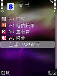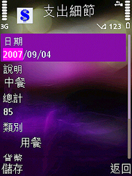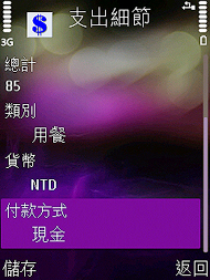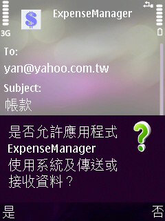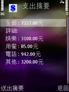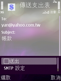 此外,使用者還可透過 3G 連線,將這些完成的支出摘要以 mail 的方式傳送出去,完成資料備分的工作。