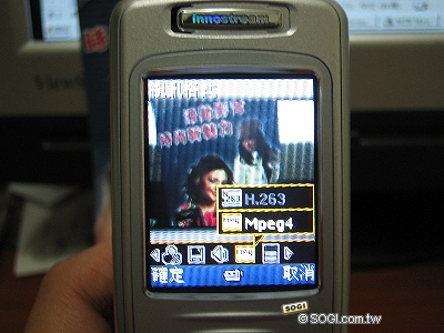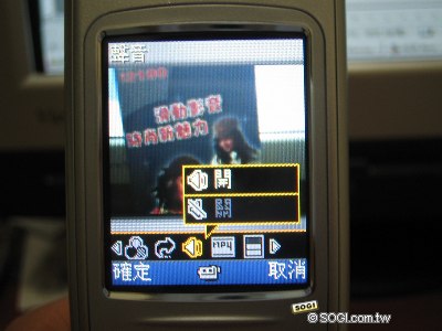 另外還可錄製多段動態影片,加上記憶卡作靠山,錄製時間可直到整張記憶卡錄滿為止。貼心的是使用者可自行選擇要錄下「有聲」或「無聲」影片,還可選擇影片格式要為常見的MPEG4或H.263格式;若想將影片以MMS傳送出去,則可點選「發送」,手機便會將檔案自動壓縮至300K以下,降低檔案輸送失敗機率。