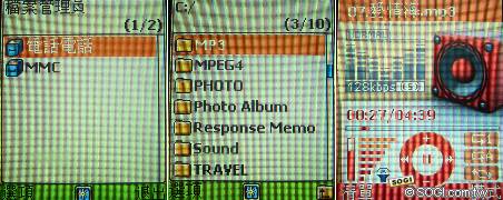 擁有隨身碟「隨插即用」的特色,將USB傳輸線接上手機與電腦,便可將想聽的歌曲拖曳至手機的MP3資料夾中,再利用i3100內建的音樂播放器播放出來。有趣的是,存至手機的MP3歌曲皆會存放MMC記憶卡中,需先至檔案管理員→MMC記憶卡→MP3播放機才可順利聆聽。播放清單頗為簡化,放送模式僅有單曲、重複與全部播放三種,相當好上手。