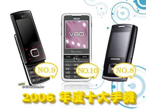 入選 2006 前十大居第八的 Samsung SGH-E908,厚度僅 16.5mm,內建功能卻不少,2007 Samsung 將會有更多款超薄手機上市,屆時在名次排名上是否能更加前面,手機王持非常樂觀的態度。另一家韓系廠商 LG,2006 年大打時尚巧克力機的口號,的確引起許多熱情的迴響,尤其是在 2006 下半年,更多色的巧克力機,讓 LG KG800 穩穩的搶下 2006 年度前十大排行的第九名。