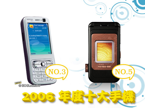 2006 年度排行第三名的是 Nokia N73。諾基亞 2006 年投下許多心力與創意在 N 系列手機上,不僅使用最專業的卡爾蔡司光學認證鏡頭、連線上網部分除了 3G 上網之外,有些 N 系列手機還支援 Wi-Fi 連線功能,在作業系統上,也是值入應用範圍廣泛的 Symbian S60 系統,強大豐富的多媒體影音應用當然就不必多說了。現在,N73 黑色網際網路加強版搶在 2006 年年底上市,網友的詢問度非常熱烈,再加上 2007 年第一季預計推出的 N 系列旗艦機種 N95,諾基亞在 2007 年的表現將更加精采!