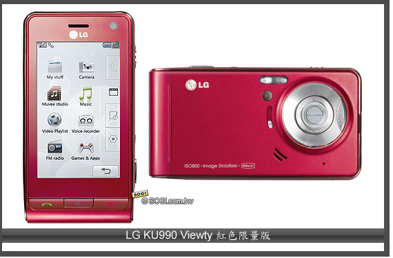 LG | KU990 Viewty 紅色限量版 | 3.5G | 3 吋 | 500 萬畫素 | 全觸控介面螢幕、ISO 800、數位防手震 |