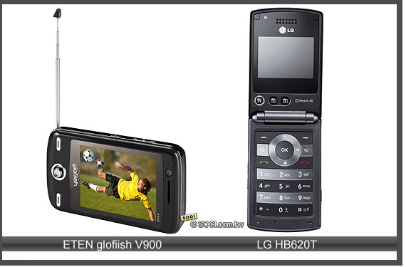 在 9 月份 LG 和 ETEN 不約而同推出 DVB-T 規格的數位電視手機,型號分別為 HB620T 和 glofiish V900。 LG HB620T 外型與一般的摺疊手機沒什麼兩樣,不過掀開之後卻可很明顯的在 2.2 吋 26 萬色 TFT LCD 下方發現 DVB-T 電視功能快捷功能鍵,透過此功能鍵即可立即操作使用電視手機基本的選台功能。當然,要收看電視時仍必須記得拉長手機背面的收訊天線。在播放上,LG HB620T 採用 LG 獨特的 Mobile XD 引擎以加強其電視節目的播放品質,在視訊的解析度與流暢度上應該不會太差。