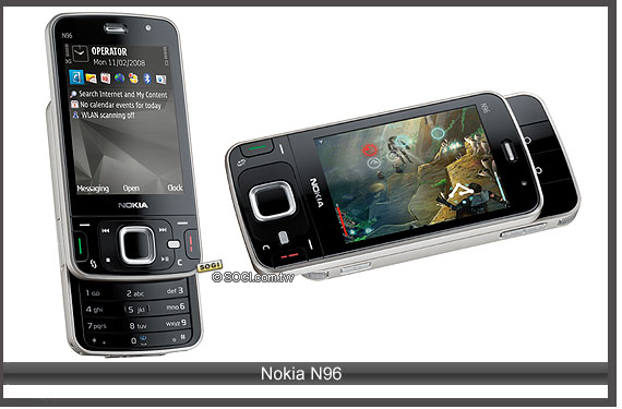 N96 之所以被封為新一代機王,就是具備了最新 Symbian S60 3.2 平台、500 萬畫素卡爾蔡司鏡頭認證相機、16GB 內存記憶空間、HSDPA 高速網路、AGPS 衛星導航與 DVB-H 行動電視、Wi-Fi 無線網路通訊等,並延續 N95 雙向滑蓋的經典設計,SOGI 在九月初將有後續報導。