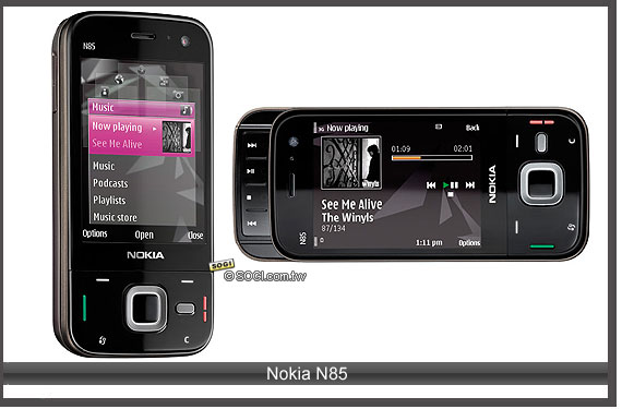Nokia N85 是 N 系列第一款採用 OLED 做為主螢幕材質,解析度維持在 QVGA、尺寸為 2.6 吋,並支援 S60 3.2 最新平台。至於 N85 的相機規格,支援 500 萬畫素卡爾蔡司專業級認證鏡頭,並支援自動對焦與雙 LED 強力閃光燈,同樣沒有採用氙氣光燈。Nokia N85 上市時間未定。