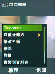 可以利用支援的藍芽無線傳輸將檔案同步,也可以選取「Diaporama」直接在手機上以投影片瀏覽,但只要還未將螢幕旋轉回原位,在這個全螢幕瀏覽的同時,任何選項都得利用觸控感應的方式來操作。