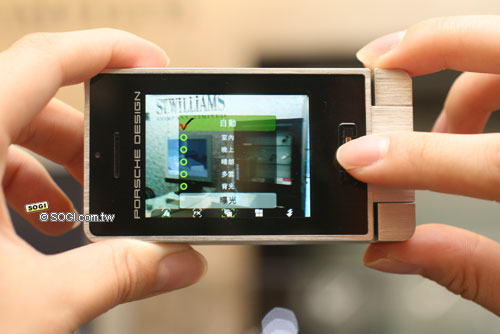 P’9521 在照相功能的部分相當特別,要進入拍照模式一定要先將螢幕 180 度向後旋轉,與底座重疊在一起才能順利進入照相的觀景窗。將畫面橫轉之後,就可以配合手機側邊的相機快捷鍵做拍照的動作。此外,拍照的功能選擇全部都要利用感應式的觸控功能來操作,在取景時左手扶住手機,右手的手指頭輕輕觸控感應區並向右滑動,選單就會隨之向右,反之亦然。除此之外,為免操作上的困擾,手機為了讓使用者在選取上做確認,只要成功感應並且移動一個選項,手機就會震動用以告知。