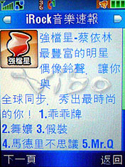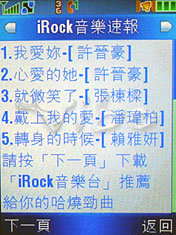 iRock 提供豐富的音樂內容,最新的音樂上架時,跑馬燈即會顯示告知使用者,因此最新的內容馬上就可得知。在瀏覽簡短的跑馬燈資訊時,都完全不需要付費。想要得知更進一步的消息,啟動 WAP 瀏覽器連線後,才需要付費。