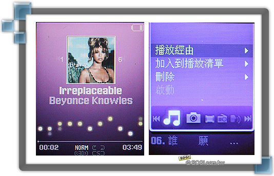 SAMSUNG F308 音樂播放介面,擁有 2.1 吋 TFT 大螢幕,加上四向指滑觸控鍵及全圖形音樂使用者介面,可以靈活操控任何功能。此外,使用雙電池設計概念的皮套電池,還可連續播放音樂達 42 小時,透過 F308 內建的 Music Library 功能,可自動編輯音樂、標籤分類,將大量的音樂納入手機當中。