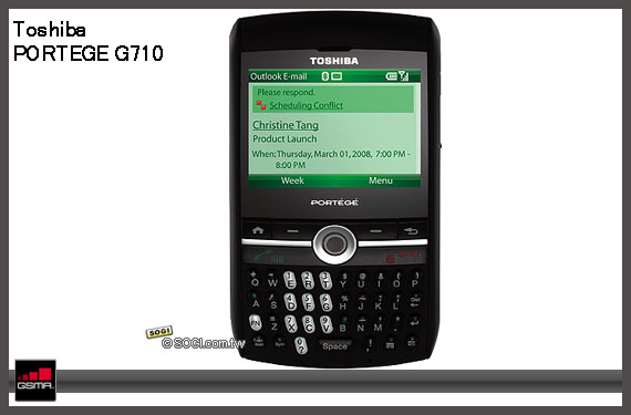 同樣是 PORTEGE 的 G 系列智慧型手機,G710 仿效黑莓機的外型,一看就是絕頂聰明!QWERTY 鍵盤與 2.46 吋 240 × 320 pixels、6 萬 5 千色 TFT QVGA 螢幕,專為收發郵件而設計。雖然未有在台灣上市計畫,也很值得一看!