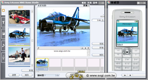 一開始的動畫還不賴,會縮小到中間就不見了,呵~~我只能這樣形容。這個一看就知道是 MMS 的編輯,可依圖片、文字、圖示、音樂、錄音等項目來進行編輯,並在右邊的視窗就可以直接預覽效果。