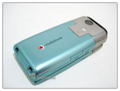 機身背面採用圓身設計,使的手握的感覺舒適,相機搭載 320 萬畫素的 AF 自動對焦相機,並支援 2 倍的光學變焦,相機旁為七色的補光燈,再過去一點是電子錢包 FeliCa 的非接觸 IC 晶片位置,機身側邊為 miniSD 卡的插槽以及耳機的插孔,手機吊飾孔設立在手機頂端轉軸附近。