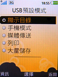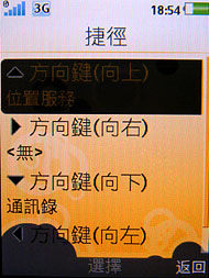 ★ 捷徑往上被鎖定為位置服務,其他三個方向都能自行設定;USB 傳輸模式有顯示目錄、手機模式、媒體傳送、列印、大量儲存等;網路模式有 GSM 及 3G、限 GSM 兩種,沒有純 3G 模式和純 HSDPA 模式可以選。