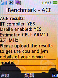 ARM 與 Jbenchmark 合作開發的測試程式「ARM CPU Estimator(ACE)」,可測試手機的處理器與 Java 效能,CPU 資訊以及圖表。測試的方法非常簡單,只要將 ACE 程式傳到手機或記憶卡當中,打開程式在手機上安裝即可。安裝完成後,打開 ACE 應用程式檔案並執行,即可就可以看到如 CPU Family、時脈與 Java 效能圖表等資訊。
