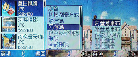 在內螢幕與外螢幕的內建桌布檔案中,使用者只要把圖片檔案之中選擇「另存為 ...」這個功能鍵,就可以達到內螢幕、外螢幕互相交替設置,其中還包括設置為來電大頭貼。簡單的說,就是可以將外螢幕的桌布另外設定為內螢幕的桌布,反之亦然。