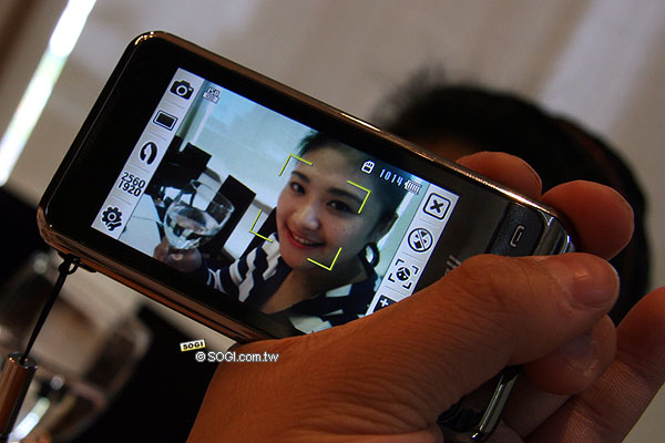 Samsung i908 Omnia 除了有 PDA 功能之外,還延續 G608、G808、U908、F488 等手機的 500 萬畫素相機,也成為 500 萬相機機種最齊全的手機大廠。除了支援自動對焦、相片定位、臉部追蹤對焦、數位防手震等功能之外,也是三星第二款具有微笑對焦功能的手機,前一款是 F488。值得一提的是 i908 的拍照介面有稍微改善,不像 F488 找半天也找不到微笑對焦的設定,在臉部辨識和微笑對焦的成功率也比 F488 高上許多。