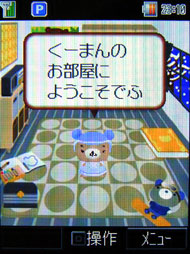 Ku-Man 的家和 Ku-Man 主題待機小精靈,是 Toshiba 這一系列手機的最大特色,814T 當中也有這項功能。進入 814T 的小熊的家程式裡,還可以幫它變身換上可愛的小兔子裝,這時再切回待機桌面,發現桌面上的 Ku-Man 也會隨著變身。