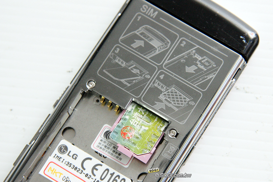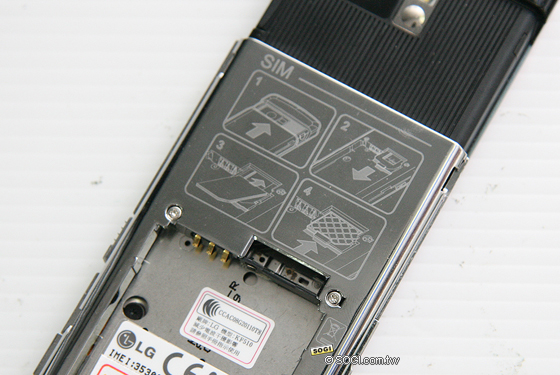 KF510 使用 800 mAh 的 LG 原廠鋰電池,最高可提供 150 分鐘的通話時間,或者是 250 小時待機時間。卸下電池後,SIM 卡置入方式也很特殊,闔蓋時,可拉出 SIM 卡插槽的小抽屜,放入 SIM 卡後,把手機推成滑蓋,小抽屜會自然卡進去機體。