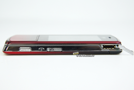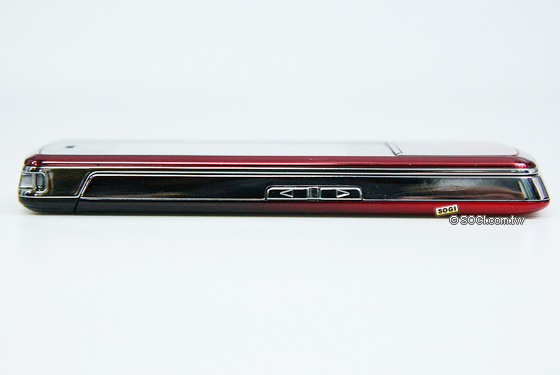 機側右邊放了充電 / 耳機 / 傳輸三用插槽、按鍵鎖、電源鍵,以及 MP3 音樂 / 拍照快門複合鍵。左邊則單純的只有音量調整上下鍵,與下方轉角處的吊飾孔。