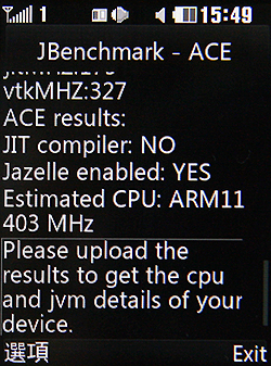 ARM 與 JBenchmark 合作開發的測試程式「ARM CPU Estimator(ACE)」,可測試手機的處理器與 Java 效能,以及 CPU 資訊以及圖表。測試的方法非常簡單,只要將 ACE 程式傳到手機或記憶卡當中,打開程式在手機上安裝即可。安裝完成後,打開 ACE 應用程式檔案並執行,即可就可以看到如 CPU Family、時脈與 Java 效能圖表等資訊。結果顯示,LG KF510 屬於 ARM11 系列,執行時脈為 403 MHz,支援 Jazelle 硬體 Java 加速。
