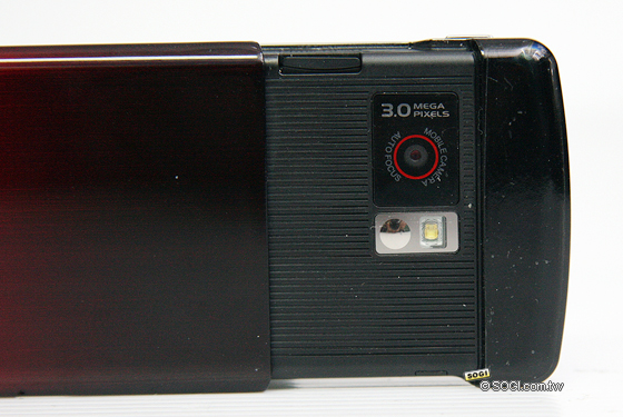 滑蓋後,320 萬畫素相機鏡頭是以橫向拍攝法設計,下方另有 SIZE 迷你的自拍鏡,與亮度尚可的閃光燈。一旁的區域用條紋裝飾,呼應背面機殼的線條。