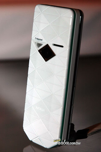 其實不僅是正面鍵盤設計採用多重的幾何圖形設計,在機身背面設計上更是採用此圖騰線條之設計概念,尤其是內建的 200 萬畫素相機鏡頭與閃光燈設計,亦是與整體機身設計理念同步。Nokia 7500 Prism 融合了 2007 年所有的時尚設計元素,包括鑽石切割工藝、立體幾何線條、黑色與寶石豔麗色的配搭、未來科技感、跨界設計等,是諾基亞今年當之無愧的時尚之星。