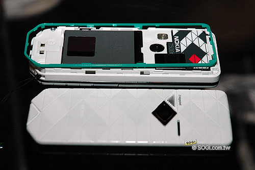 拆開 Nokia 7500 Prism,可發現在機身正面外殼與背面外殼中間,還追加了一個連接框,在目前的手機設計上,此舉似乎不常見,也呼應了 Nokia 7500 Prism 在不同色系之線條搭配理念,多了個與機身不同色的環框,看起來更加具備原創者的巧思。
