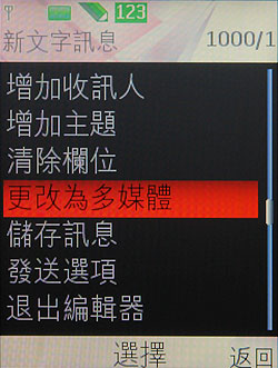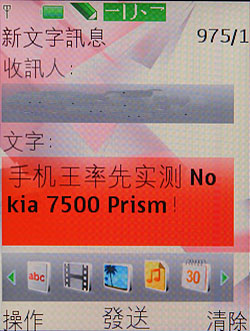 除此之外,Nokia 7500 Prism 亦具備多媒體簡訊發送功能,此功能雖然在目前的手機中已幾乎是標準配備,但是在使用介面上卻是更加人性化,關鍵在於螢幕底下會直接橫向秀出欲安插的多媒體檔案圖示,此改良式介面讓操作上更加順手。