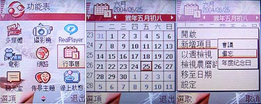 Nokia 7610 的行事曆還算豐富,可以代替筆記本,紀錄提醒使用者每一天的行程規劃,另外,它還支援農曆,有些特別日子是必須看農曆才知道的,例如七夕情人節,以後七夕情人節到了,情侶們就不怕 lose囉!