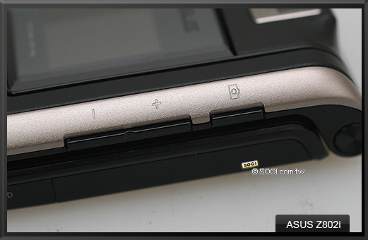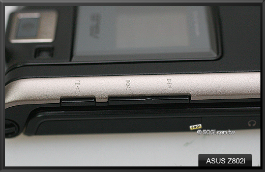 在機身正面上蓋右側,可以看到 ASUS Z802i 的相機快捷鍵 ( 可充當快門鍵 ),此鍵的操作原理是,當掀蓋時,按一次,即可在內螢幕上開啟拍攝畫面功能,緊接著闔蓋便可將拍攝取景窗轉移至外螢幕,不過要特別注意的是,當闔蓋時按下此鍵,卻無法開啟外螢幕拍攝畫面,也就是說,必須掀蓋才有效。