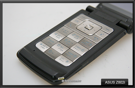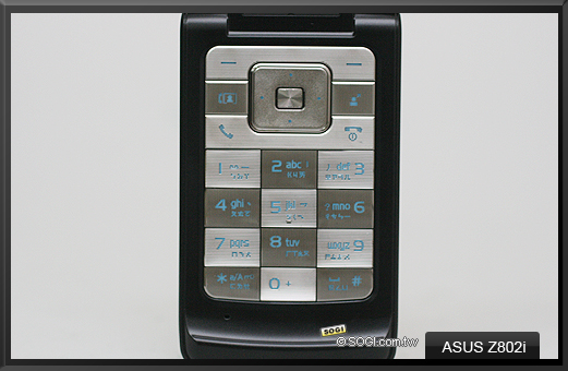 除了皮革材質加身之外,ASUS Z802i 在操作按鍵設計上亦多有著墨,如上圖,可以很明顯的發現其數字按鍵以類似西洋棋格狀來排列,另外,鍍鉻金材質按鍵加上織品紋理,高雅質感在燈光下亦顯得千變萬化。