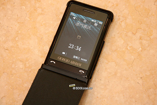 購買時會附贈原廠皮套,讓手機可以隨時受到保護。Giorgio Armani-Samsung 手機只有 10mm 的厚度,拿在手中相當的輕巧,沒有多餘的按鍵設計,維持簡約的原則。少了實體按鍵,Giorgio Armani-Samsung 手機以觸控式螢幕來取代,可透過 2.6 吋全螢幕來觸控、輸入。不過,可惜的是雖然有 2.6 吋的螢幕,解析度卻依然停留在 QVGA 的規格,細膩度沒有提升。