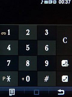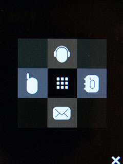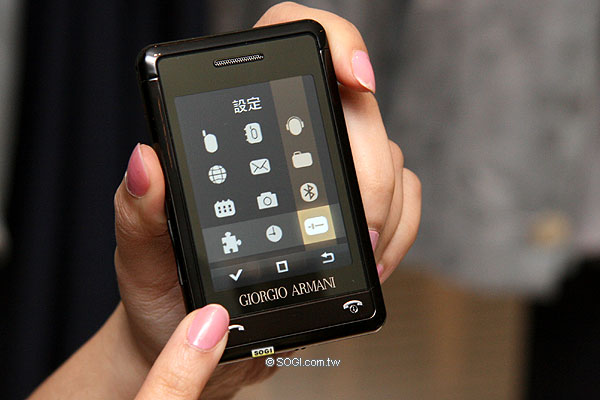 在整體介面上延續 Samsung 手機的介面之外,還加入了十字向選單功能。就像上面兩張圖的內容,在桌面按下中間的主目錄鍵後,會先進入左邊的十字鍵選單,上下左右可以快捷進入最常用的功能,按下中間即可進入傳統的十二宮格選單。包含手機內的圖示、撥號選單等,都是由 Giorgio Armani 團隊親自操刀設計,因此向以下的方格排列之撥號介面,也只有 Giorgio Armani-Samsung 手機才會有。