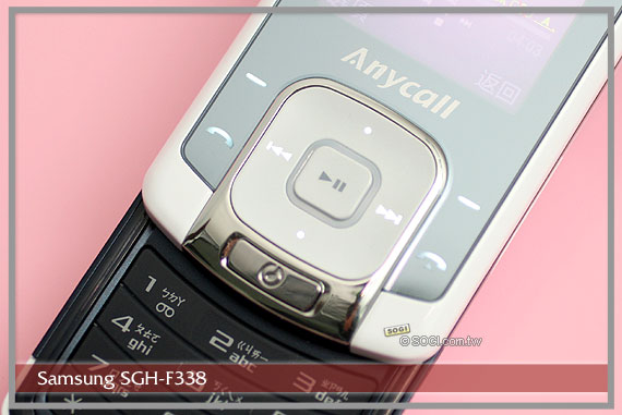 Samsung F338 音樂操作鍵下方為快捷音樂鍵,單鍵直接進入音樂功能。另外還有音符 Logo 置於前蓋與後蓋的上緣,輕易辨識出 F338 為音樂而生的設計理念,而此符號也將成為未來 Samsung 音樂手機的專屬辨識方法。