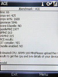 ARM 與 JBenchmark 合作開發的測試程式「ARM CPU Estimator(ACE)」,可測試手機的處理器與 Java 效能,以及 CPU 資訊以及圖表。測試的方法非常簡單,只要將 ACE 程式傳到手機或記憶卡當中,打開程式在手機上安裝即可。安裝完成後,打開 ACE 應用程式檔案並執行,即可就可以看到如 CPU Family、時脈與 Java 效能圖表等資訊。結果顯示,BenQ E72 屬於 ARM9 系列,執行時脈為 169MHz,不支援 Jazelle 硬體 Java 加速。