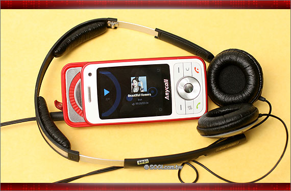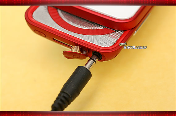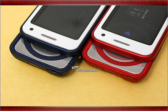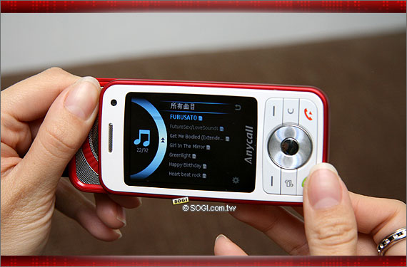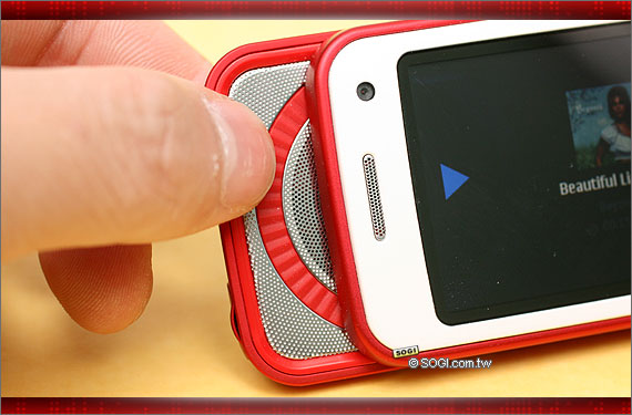 將手機往下滑進入音樂播放模式之後,其獨立的立體聲喇叭即現眼前,光看造型就很 Pro,其音效和音量也是經過特別加強。而在立體聲喇叭的周圍有一個半弧形的紅色(或藍色)觸控鍵,外型的靈感源自音響大廠 B&O Acoustic Design,它就是 i458 的 DJ 飛梭轉環,可以用來操作音樂播放, 只需在上面輕按、輕壓、輕滑三種方式交叉使用即可掌控 i458。