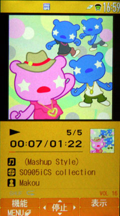 ※ 音樂播放的部份並不支援 MP3,而是支援 SD-Audio 和 WMA 格式,或是透過日本 i-mode 網路下載合法的 HE-AAC 格式音樂。SO905iCS 雖然不是 Walkman 手機,不過它的音樂播放介面也滿吸引人的,播放音樂時可以顯示超大張的專輯封面,且音樂歸類也滿完整的。另外,SO905iCS 只支援日本人常用的紅外線傳輸,不支援藍牙甚至是 A2DP,對於倚賴藍牙傳輸的台灣人來說,SO905iCS 其實有點不是那麼方便